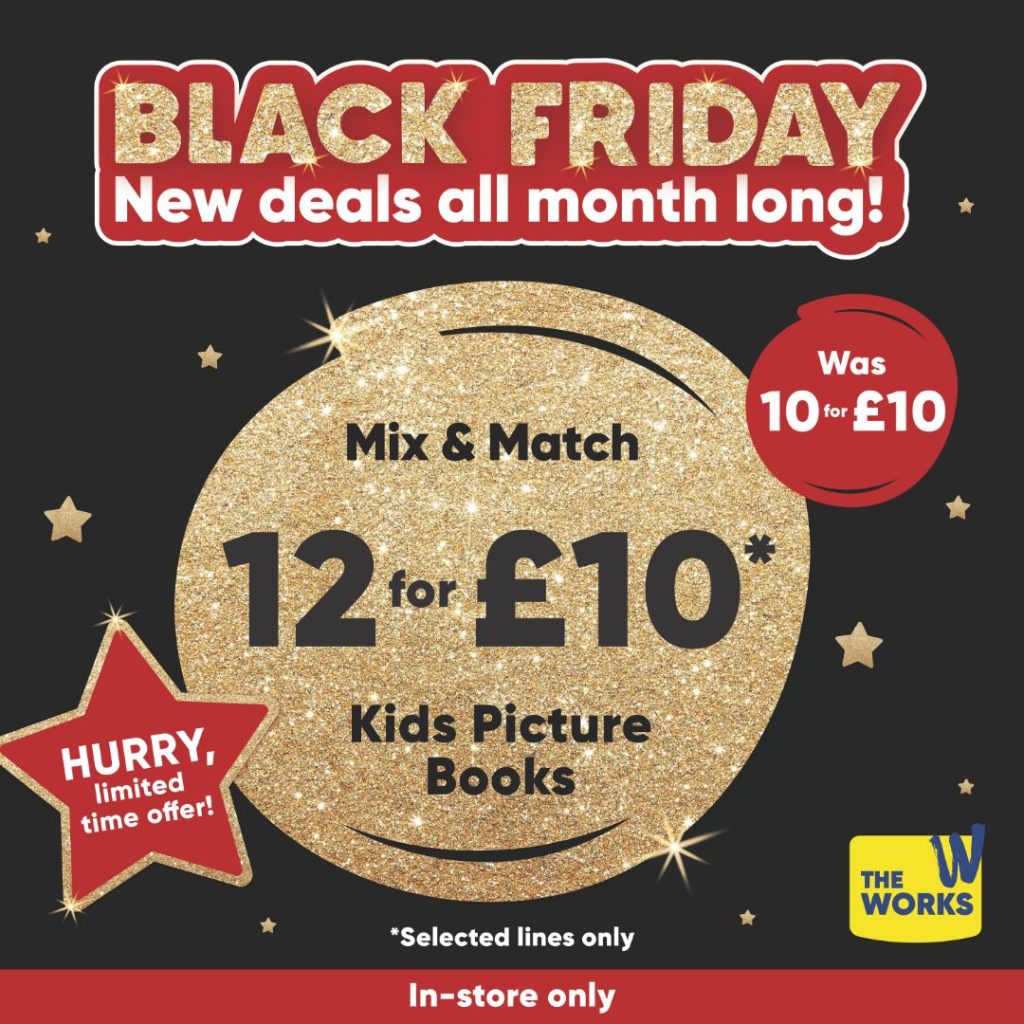 Hurry, limited time offer: 12 for £10 on Kids Picture Books! Visit The Works Silverburn for this not-to-be-missed Black Friday offer, available exclusively in store!